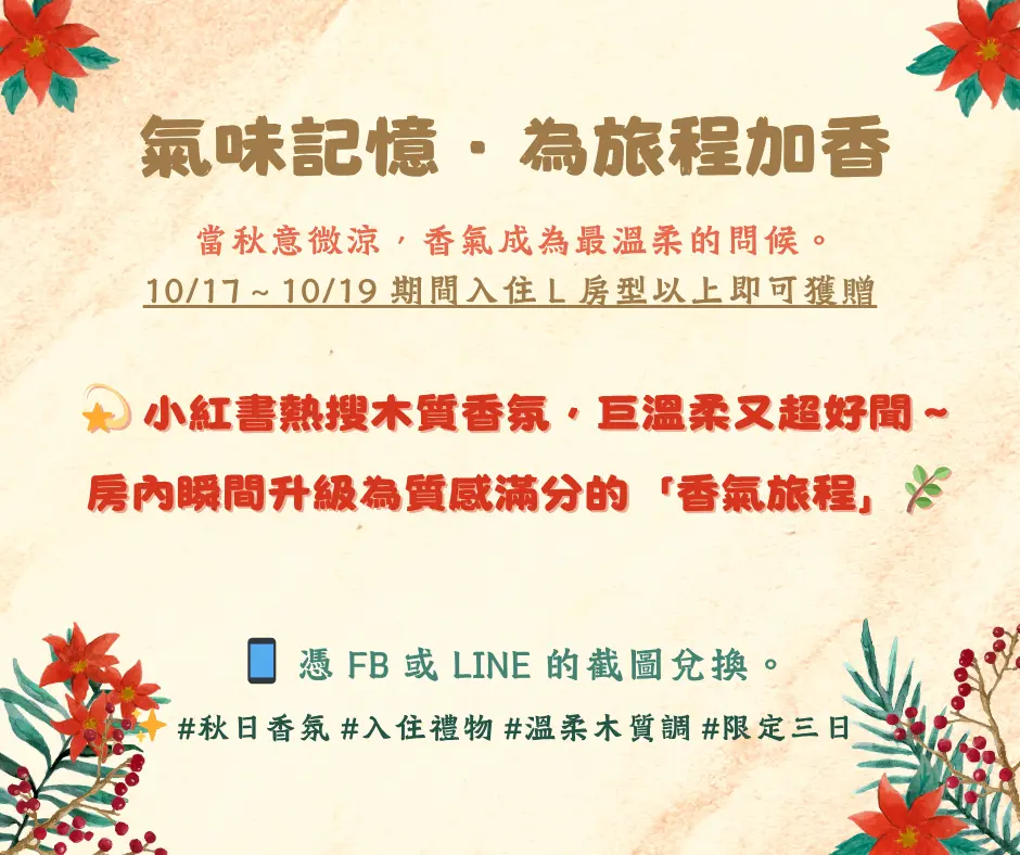 🍂把「秋日的記憶」帶回,讓香味成為再訪的理由,將短暫的住宿轉化為能漫延的回憶。